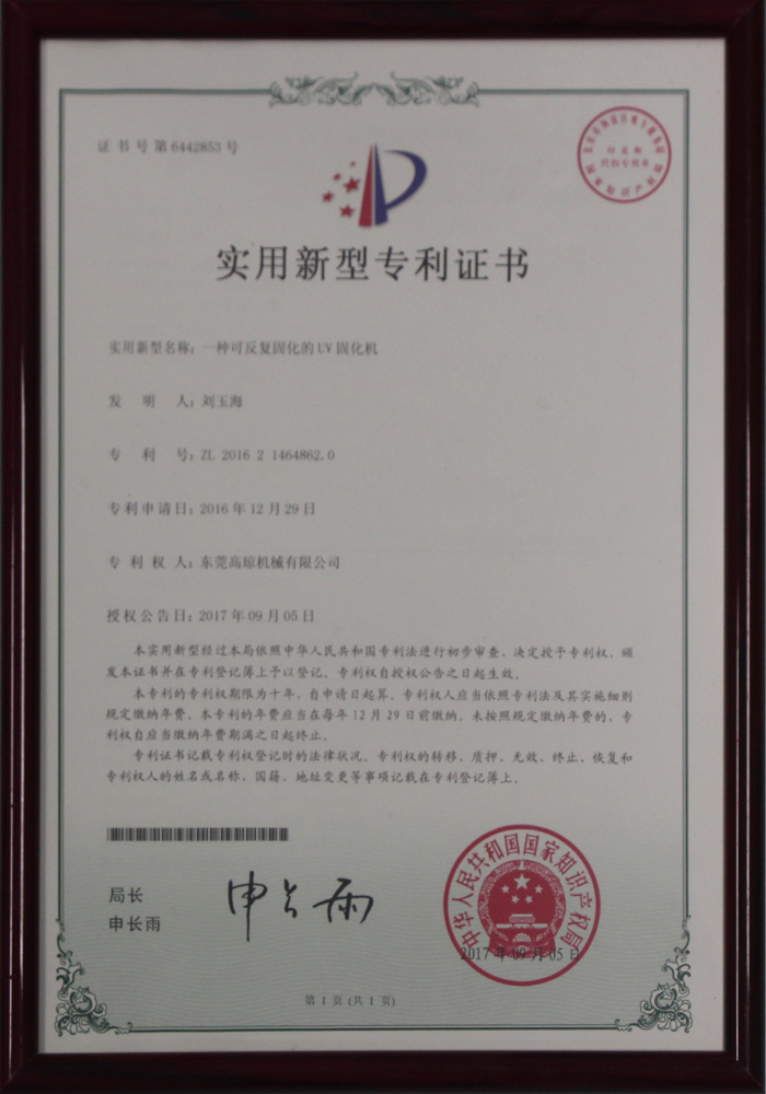 可反復(fù)固化的UV固化機(jī)專利證書(shū)